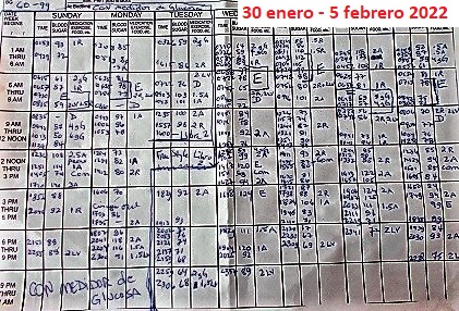 El Glucograf semanal muestra las dosis y el tipo de insulinas inyectadas, los resultados glucémicos y datos adicionales de lo que influye en éstos.